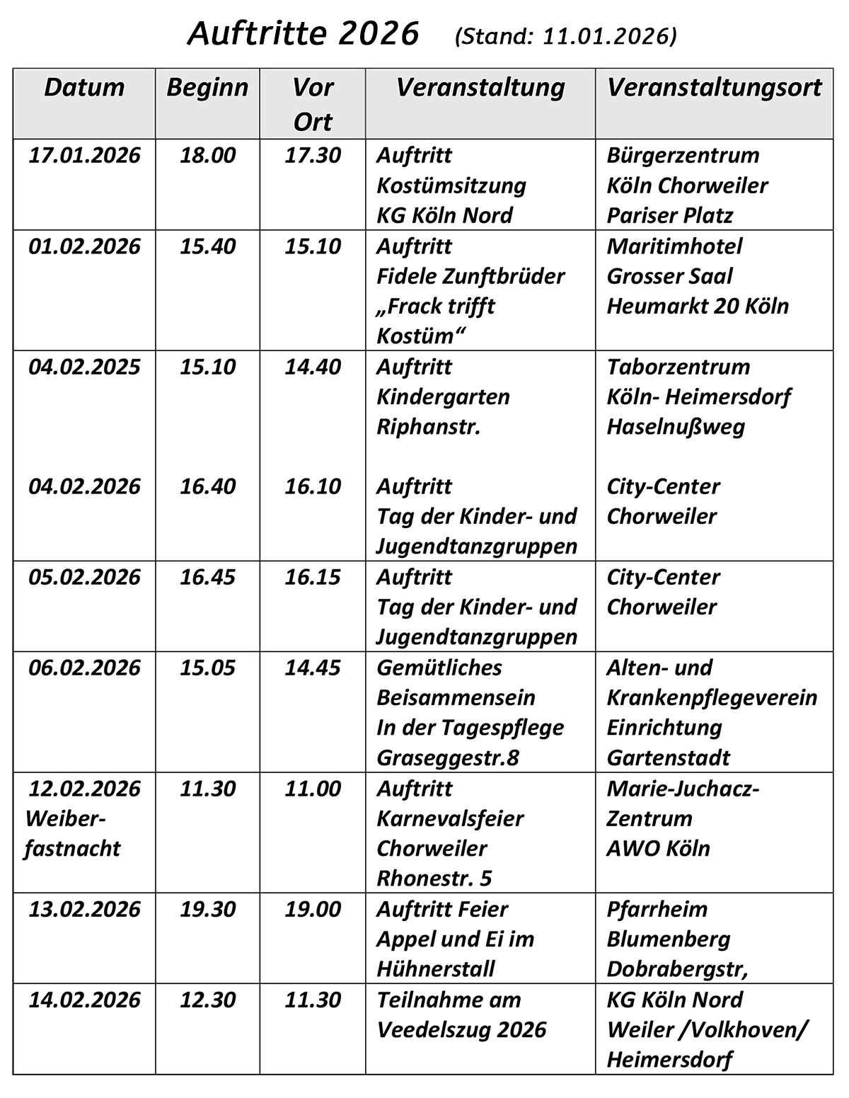 Hier ist unser aktueller Auftritts-Plan (als PDF auch zum Download) wo und wann wir zu sehen sind.